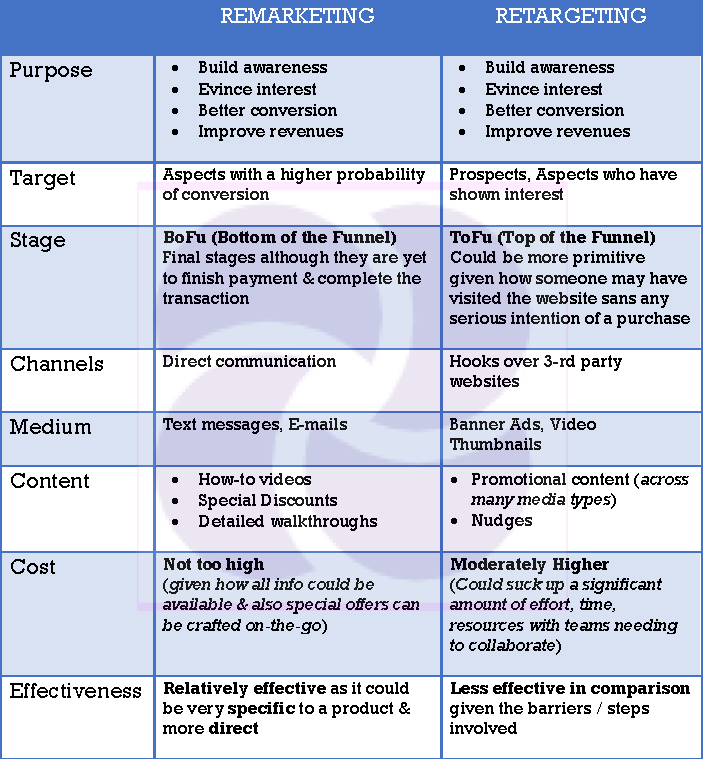 When RETARGETING earmarks & chooses to display content pertaining to those a cross-section of a sample space of prospects / aspects, REMARKETING is about pushing that small snippet of a video or a text message carrying a highly specific offer that could remove any possible doubt / confusion from the minds of customers-to-be & enable that BUY decision / any other response that’s relevant to & in favor of the org.
