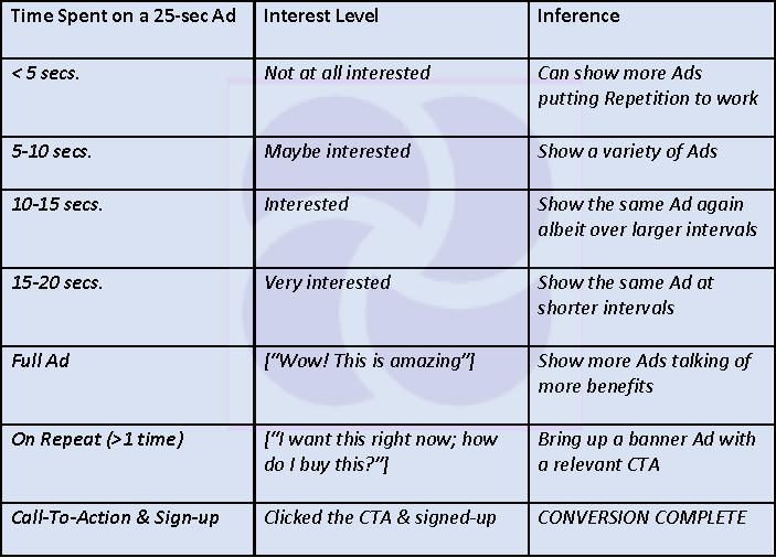 One tends to watch the Ad in full or up to a certain point that one deems relevant. That STAT adds up & is factored into the analytics so as to help bucket people based on their interests. It is possible that bucketing could use some severely complex logic that combines demographic data as apportioned across persona or even be as plain & simple as depicted here: