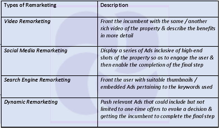 Remarketing could be of many types depending on the medium / channel used to reach out to the audience & some popular ones are: